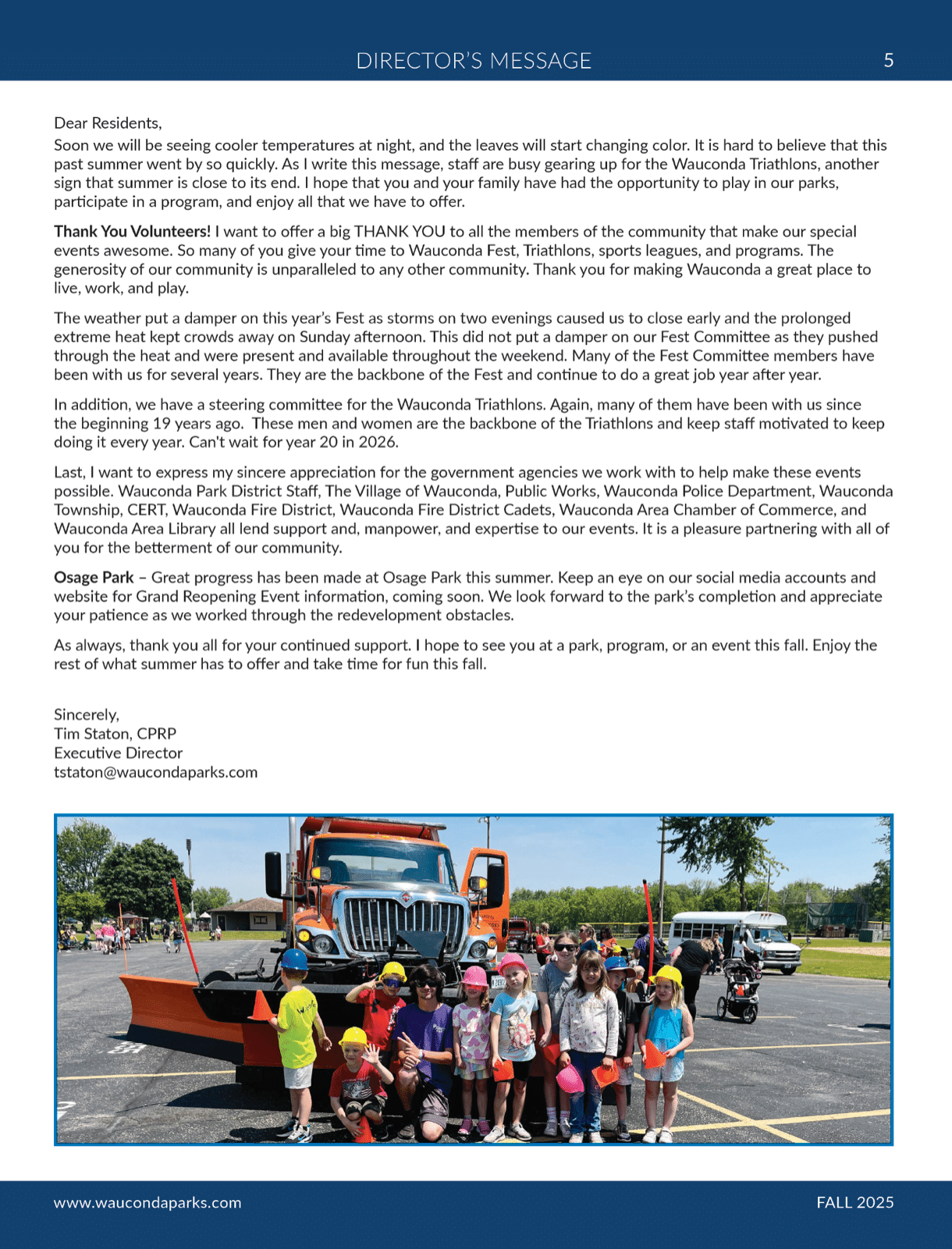 Dear Residents, Soon we will be seeing cooler temperatures at night, and the leaves will start changing color. It is hard to believe that this past summer went by so quickly. As I write this message, staff are busy gearing up for the Wauconda Triathlons, another sign that summer is [...]